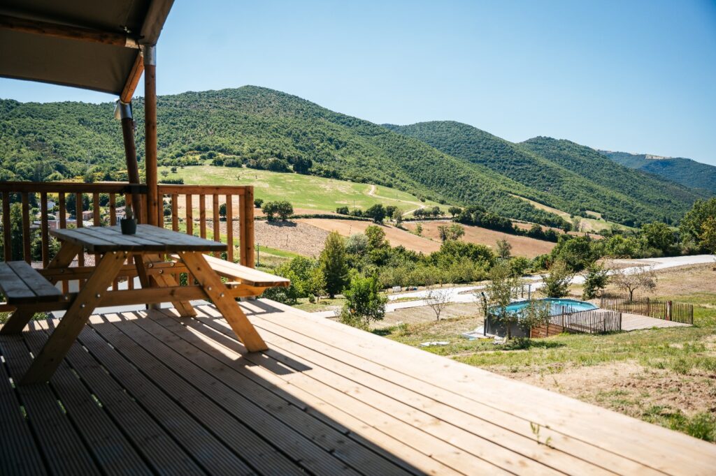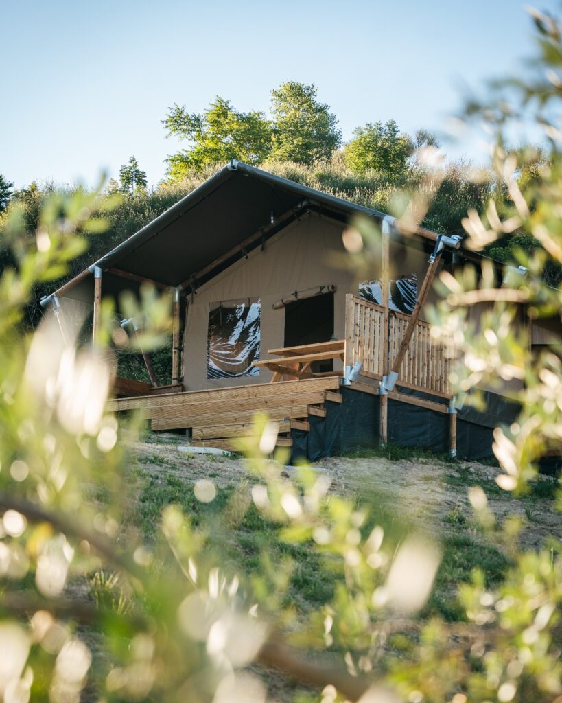 Onze intieme Safaritent XS is perfect voor twee personen. Geniet van een knus tweepersoonsbed, een vlonder met terras en zitje, en een handige overdekte buitenkeuken. Ontwaak letterlijk in de olijfboomgaard mét uitzicht op de Monte San Vicino.